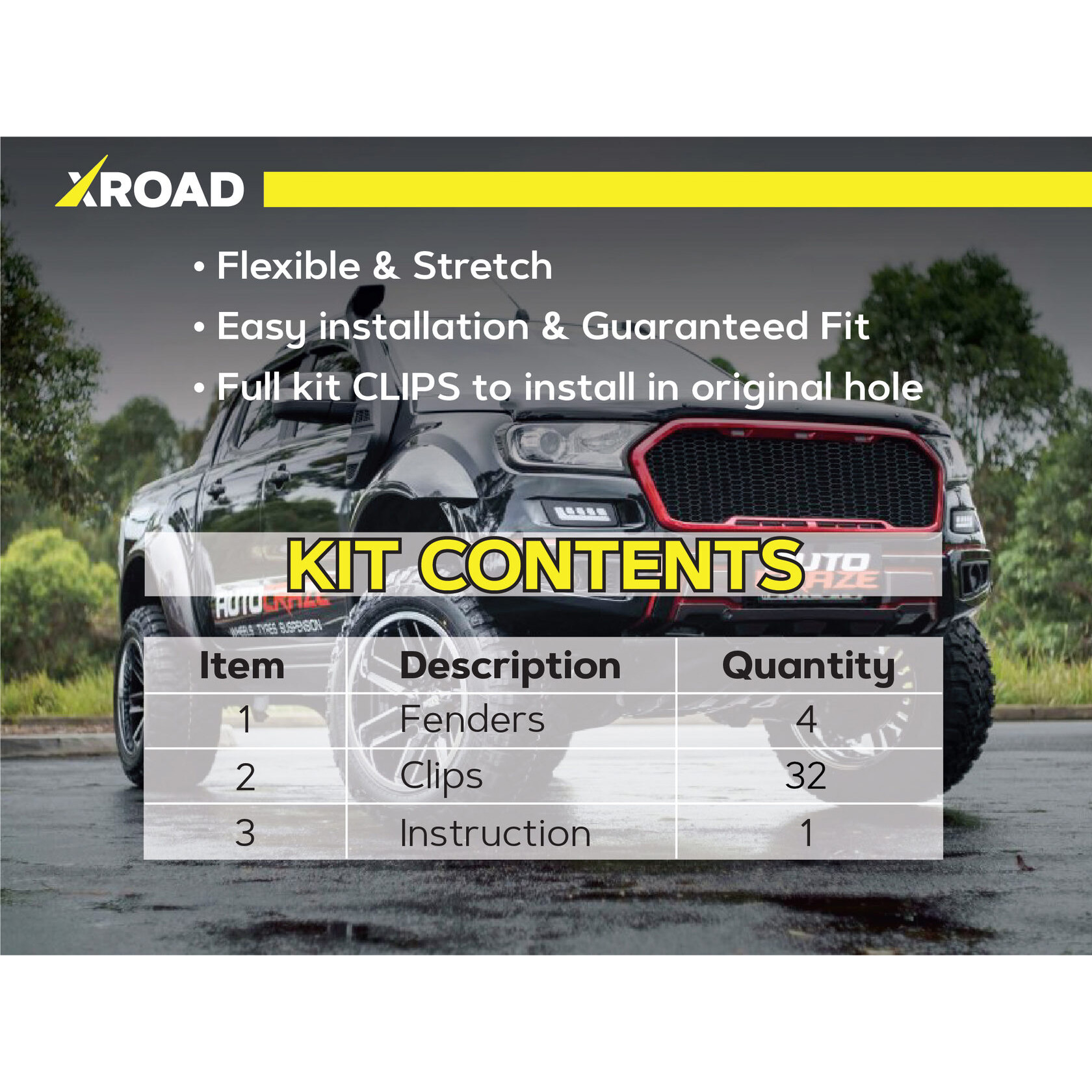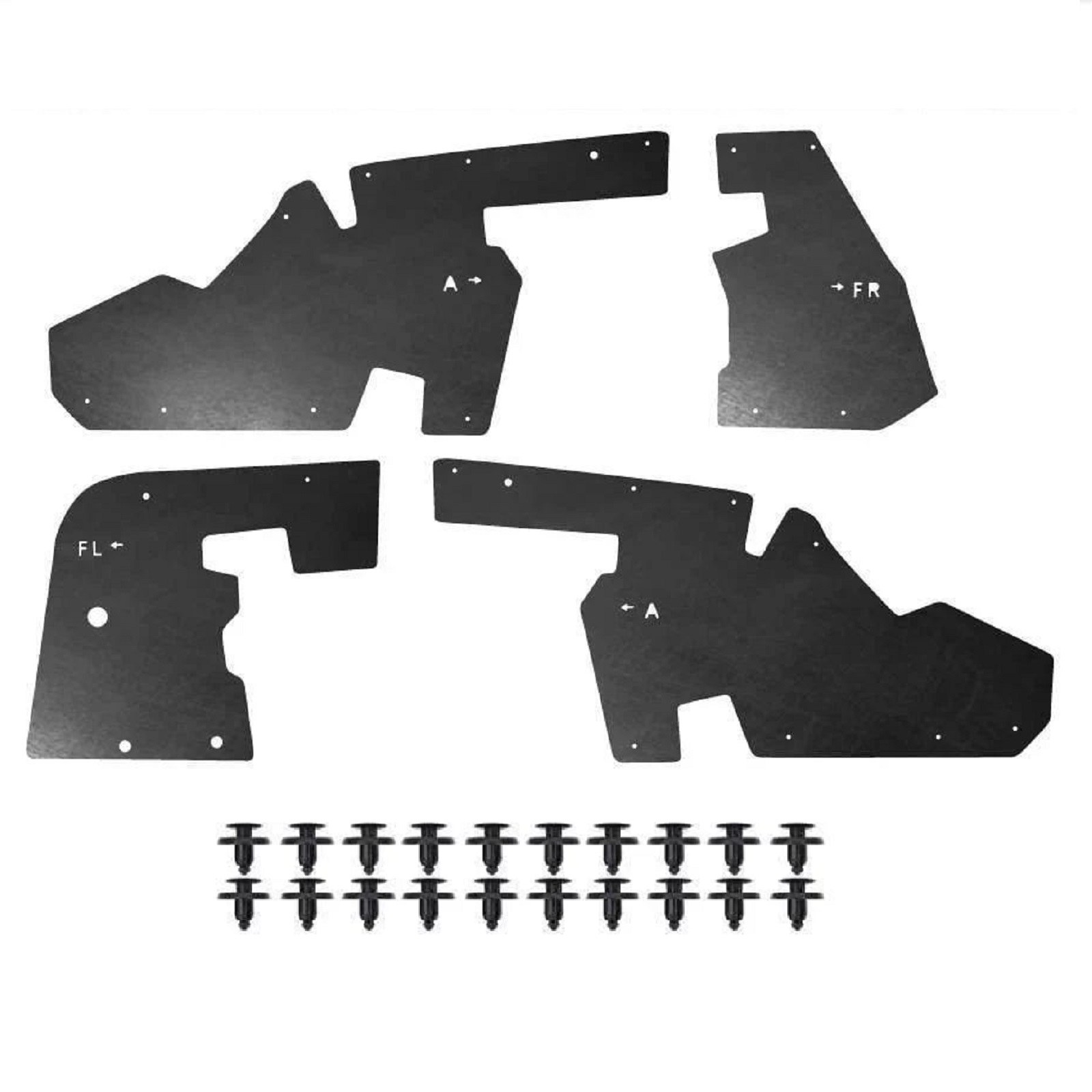 Склад комплекту: 4 посилених пильники для передніх колісних арок, монтажний набір кліпс, інструкція.