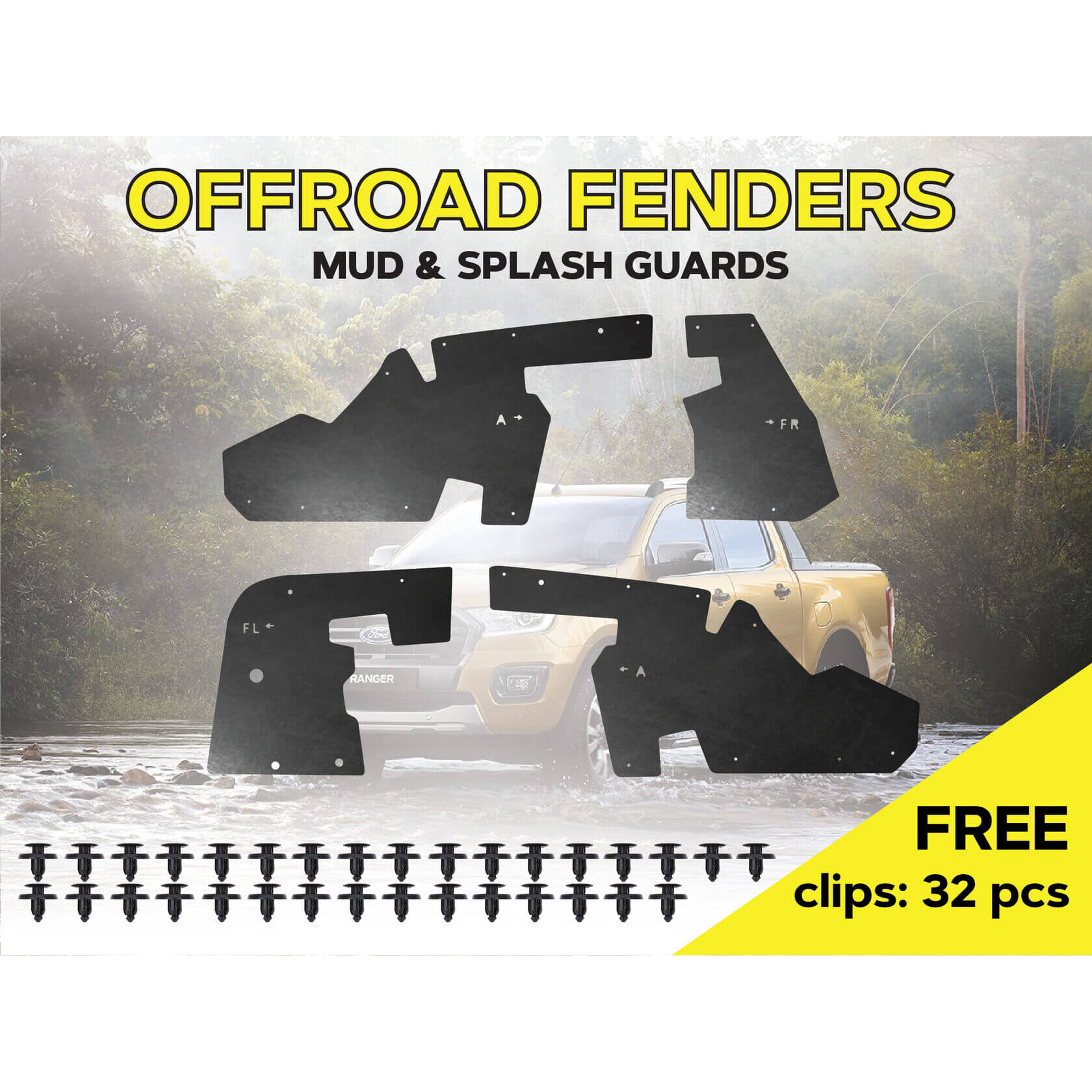 Повний комплект посиленого брудозахисту для встановлення на передню вісь автомобіля. Ефективно захищаэ не тільки моторний відсік, але й важливе електрообладнання від пилу, бруду, води, гілок, дрібних каменів та інших сторонніх елементів.