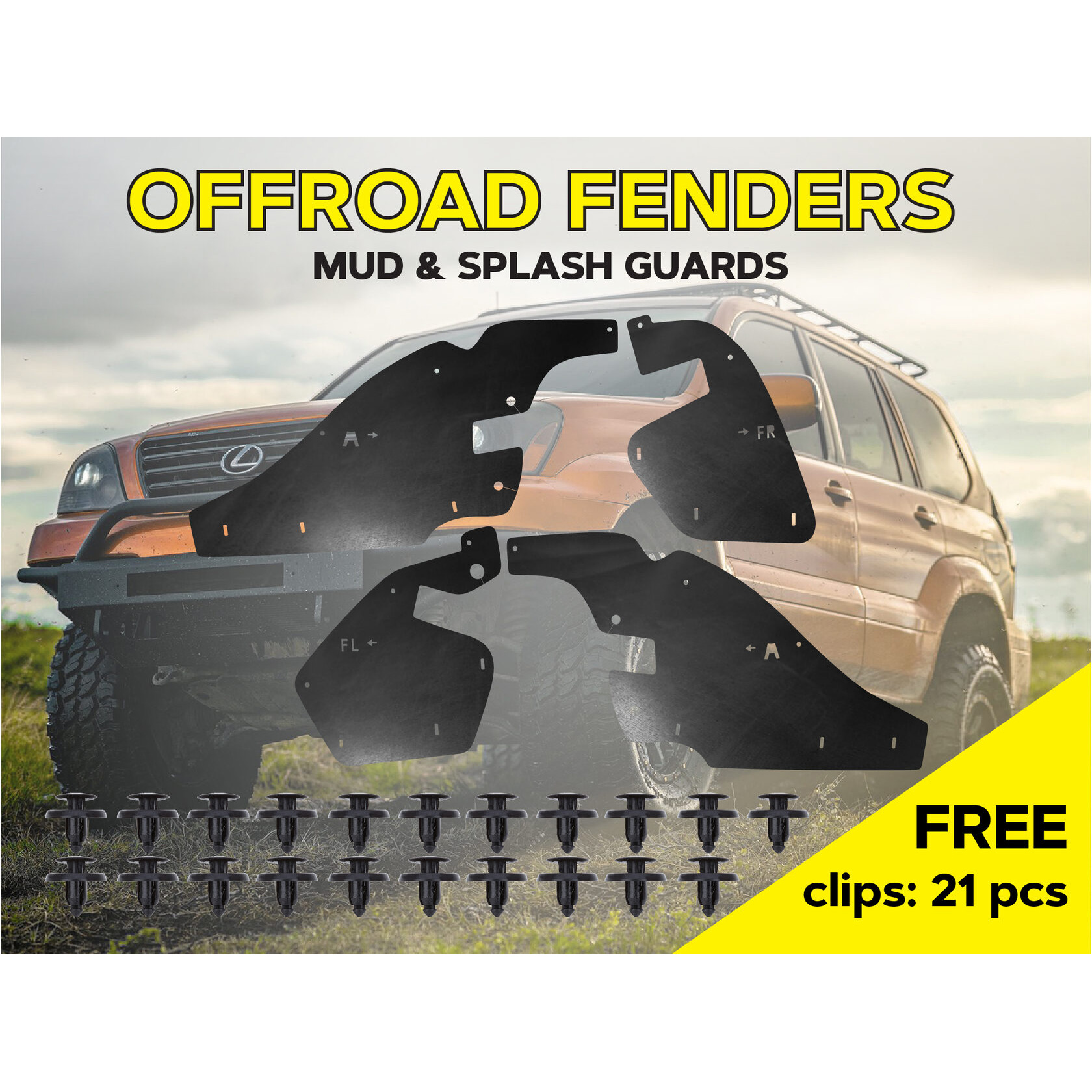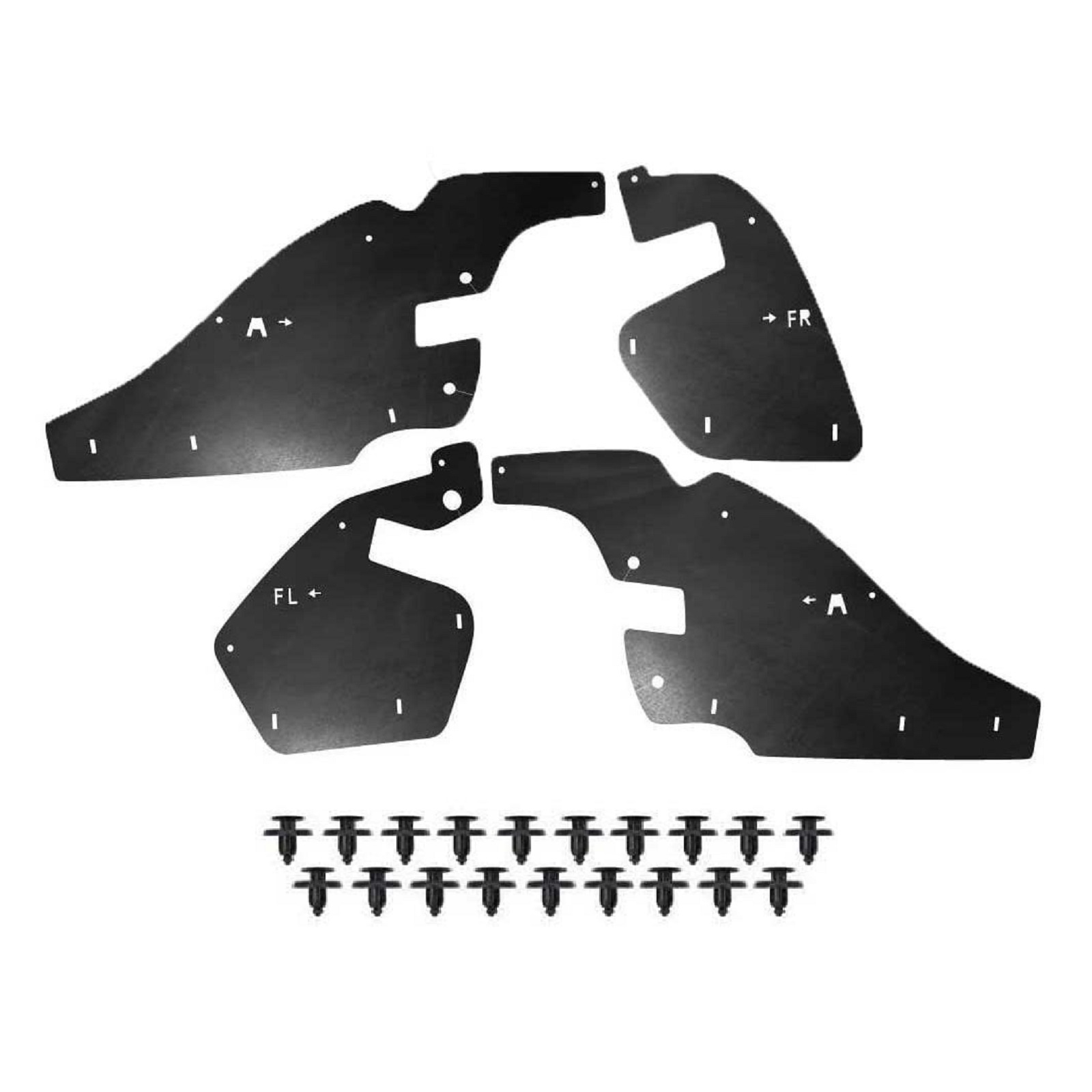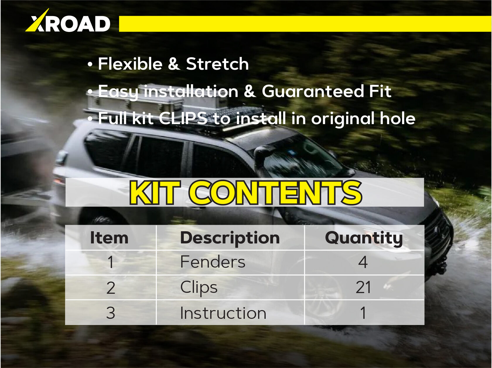 Склад комплекту: 4 посилених пильники для передніх колісних арок, монтажний набір кліпс, інструкція.