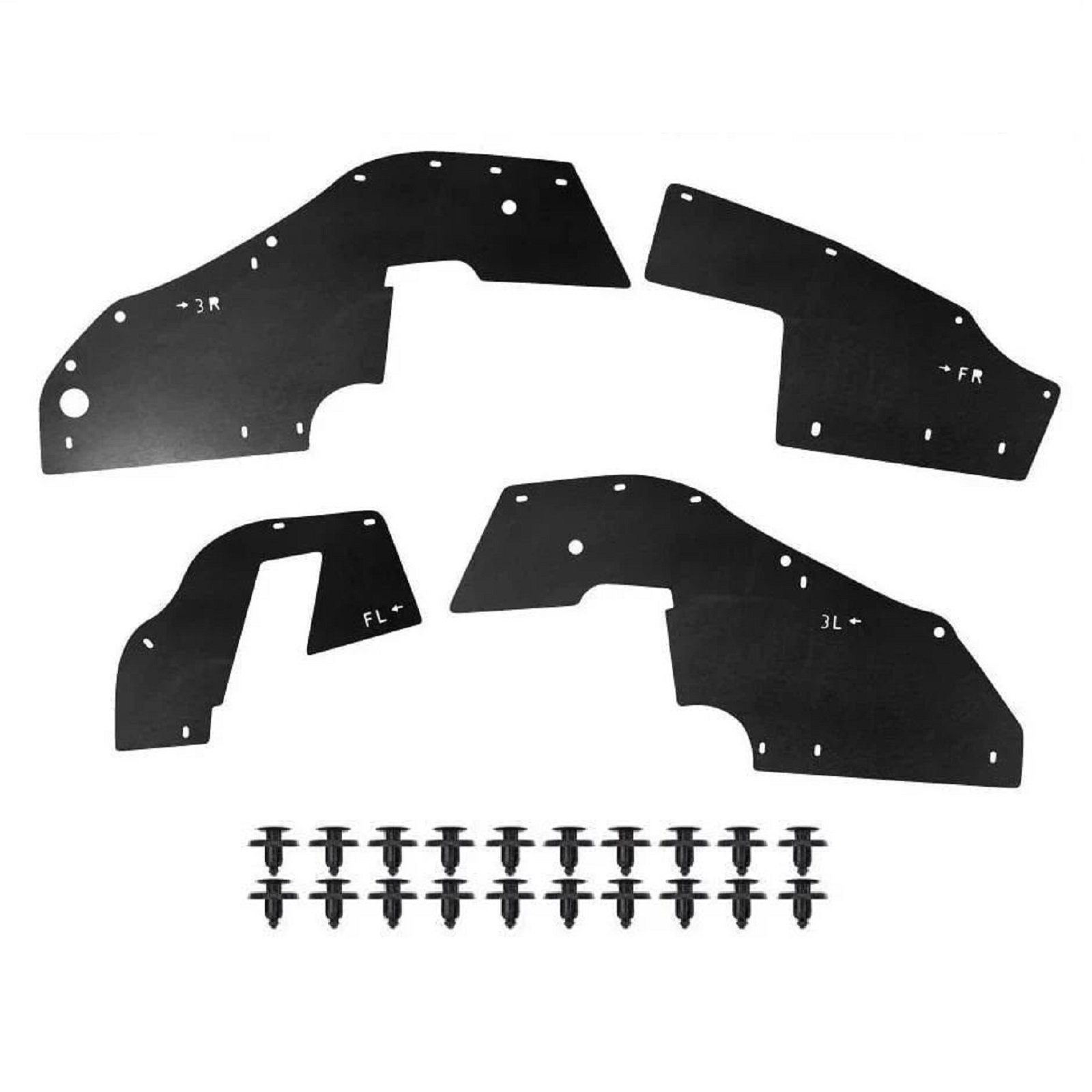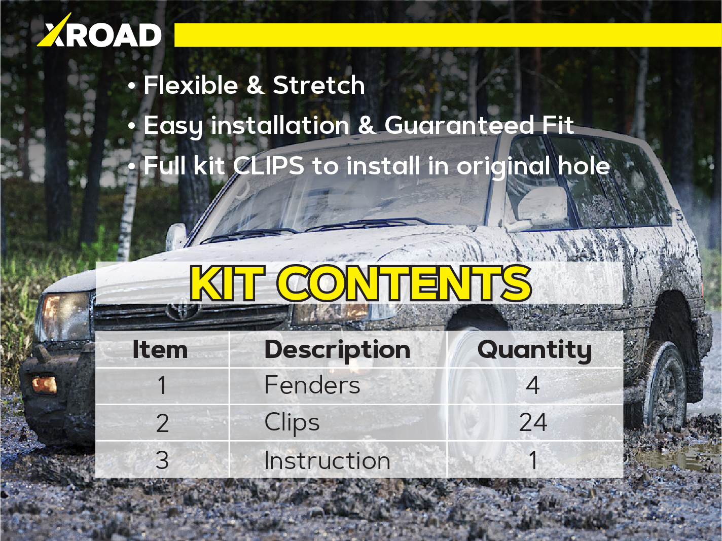 Склад комплекту: 4 посилених пильники для передніх колісних арок, монтажний набір кліпс, інструкція.