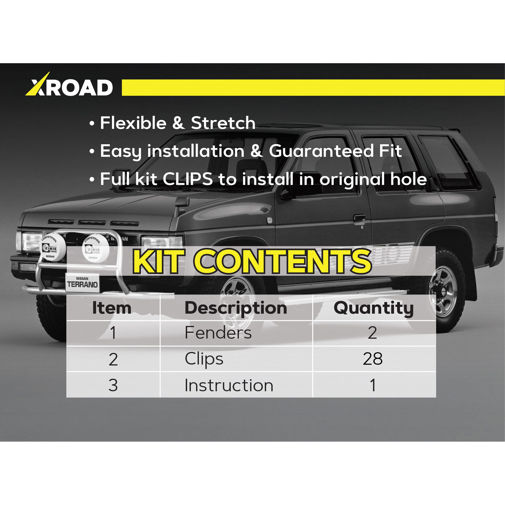 Склад комплекту: 2 посилених пильники для передніх колісних арок, монтажний набір кліпс, інструкція.