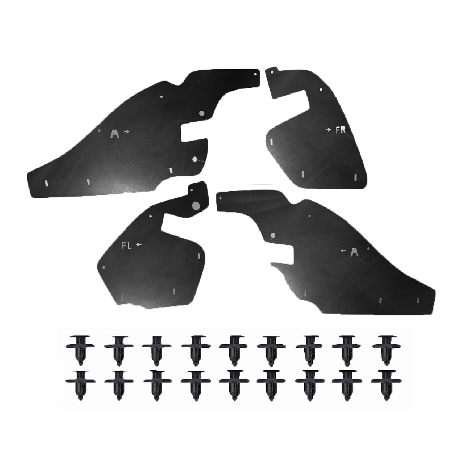 Склад комплекту: 4 посилених пильники для передніх колісних арок, монтажний набір кліпс, інструкція.