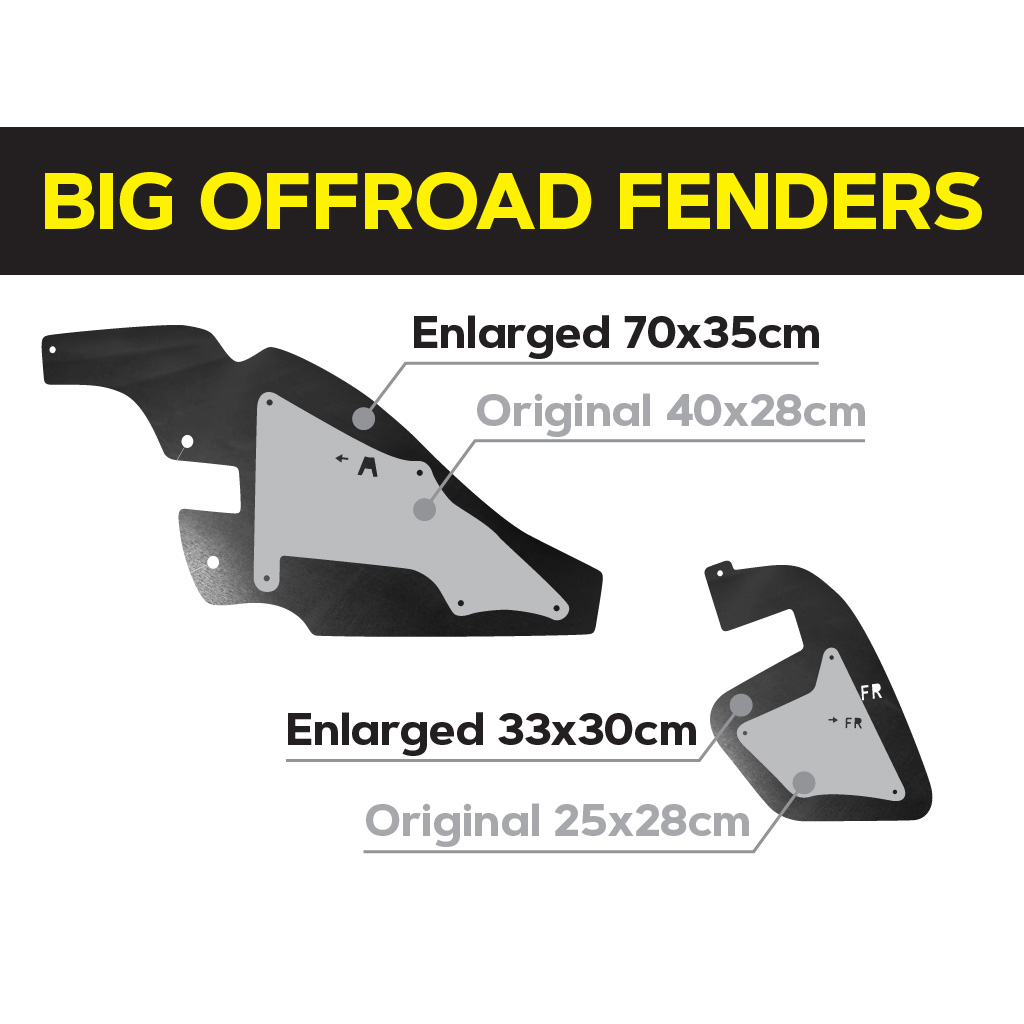 Повний комплект посиленого брудозахисту моторного відсіку для встановлення на передню вісь автомобіля. Площа посиленого брудозахисту значно більша за штатний, що дозволяє йому ефективно захищати не тільки моторний відсік, але й важливе електрообладнання, таке як генератор і стартер. Цей посилений брудозахист розроблений спеціально для експлуатації як у міських умовах, так і на найскладніших позашляхових трасах.