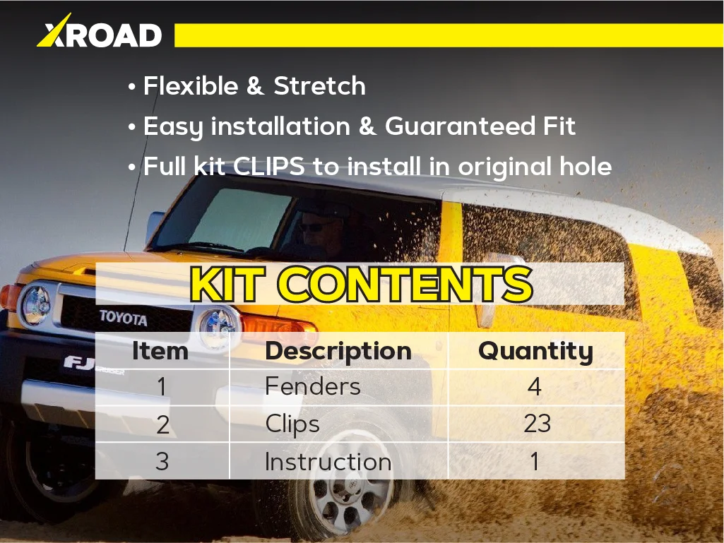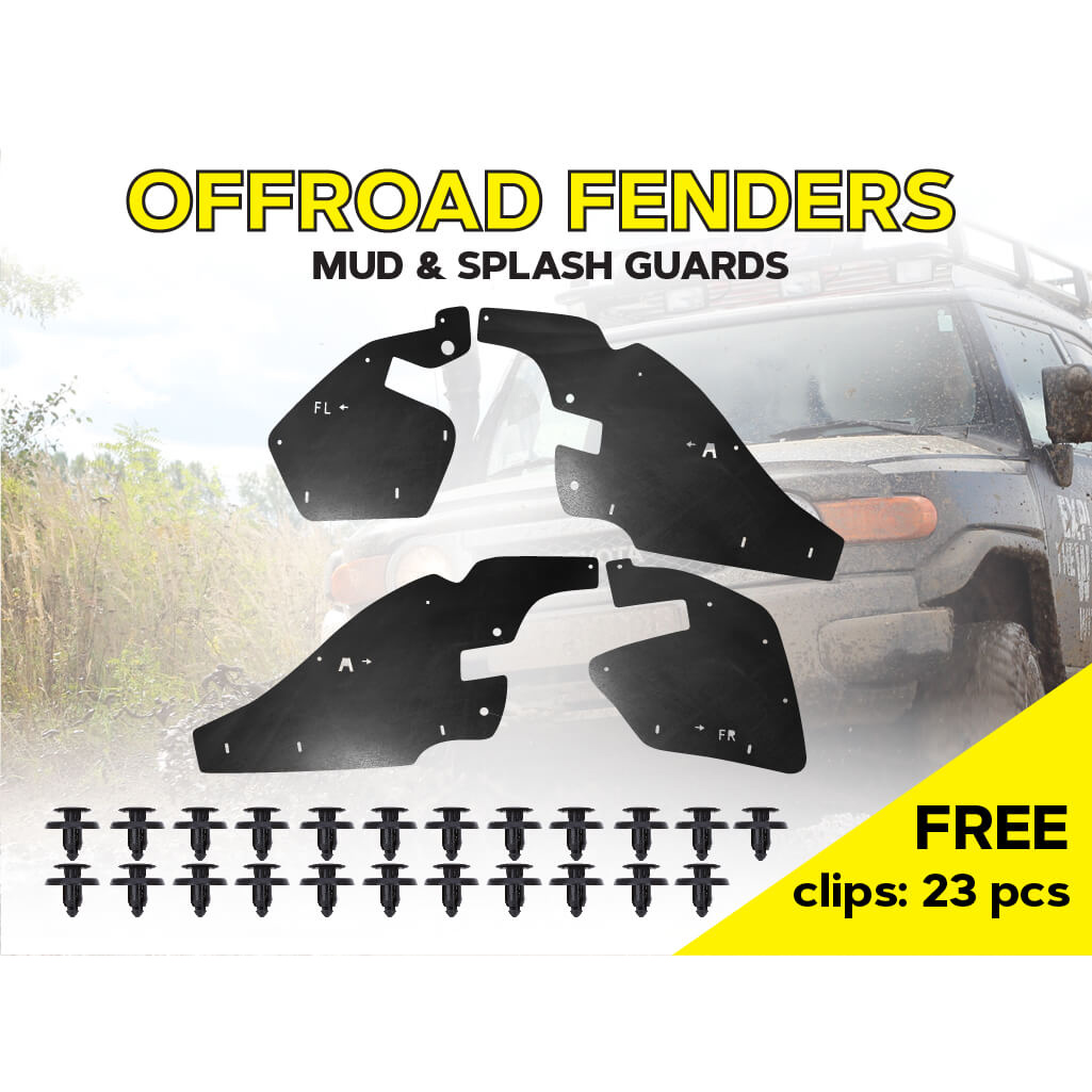 Склад комплекту: 4 посилених пильники для передніх колісних арок, монтажний набір кліпс, інструкція.