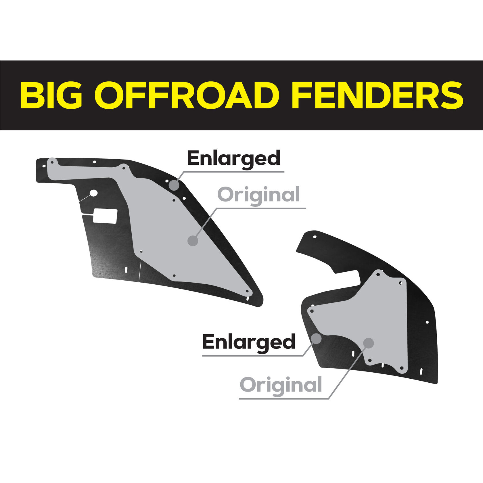 Повний комплект посиленого брудозахисту моторного відсіку для встановлення на передню вісь автомобіля. Площа посиленого брудозахисту значно більша за штатний, що дозволяє йому ефективно захищати не тільки моторний відсік, але й важливе електрообладнання, таке як генератор і стартер. Цей посилений брудозахист розроблений спеціально для експлуатації як у міських умовах, так і на найскладніших позашляхових трасах.