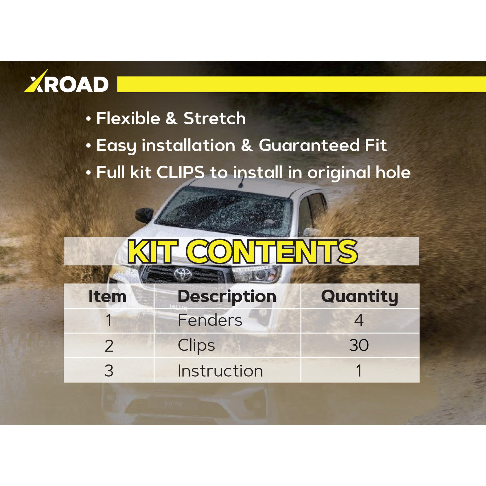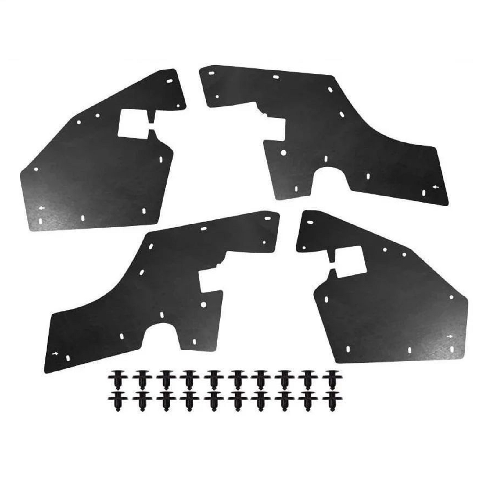 Склад комплекту: 4 посилених пильники для передніх колісних арок, монтажний набір кліпс, інструкція.