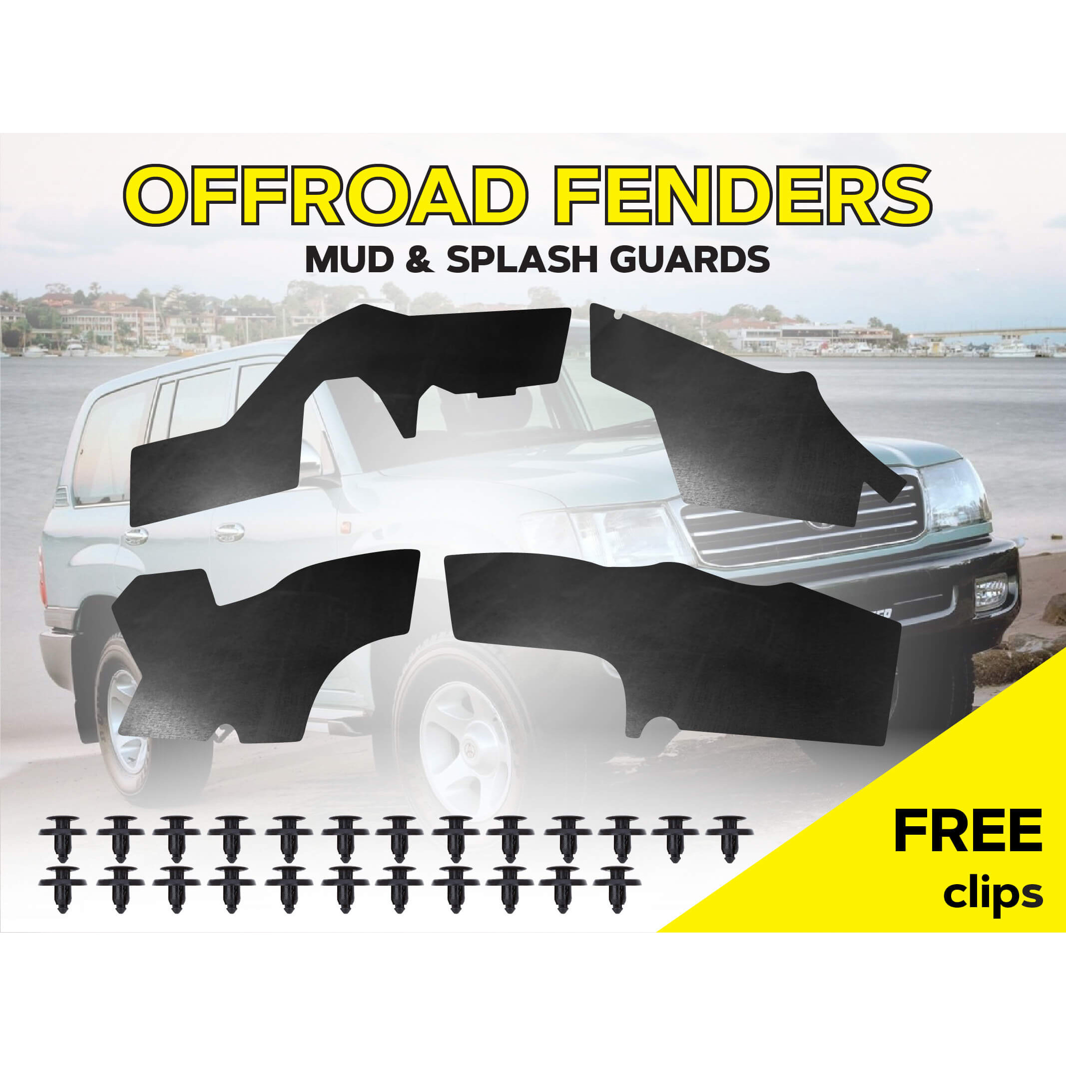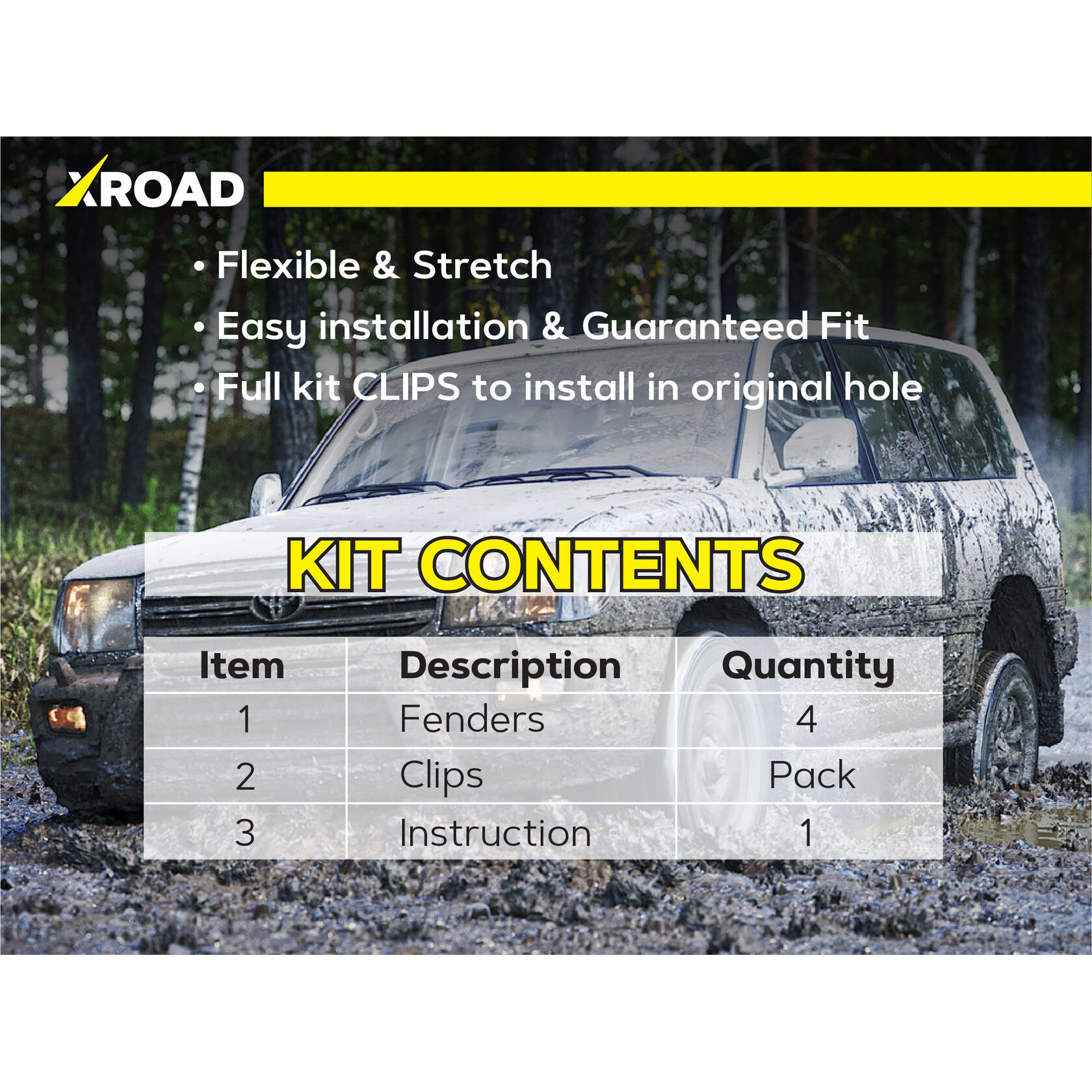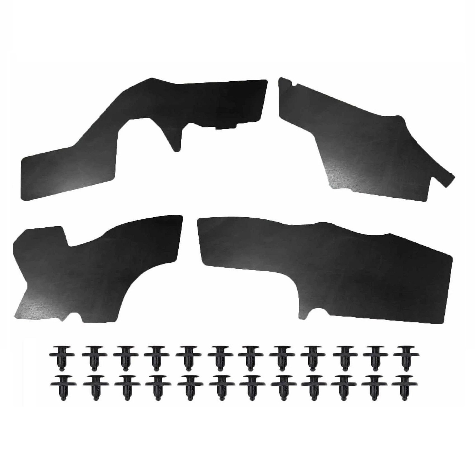 Склад комплекту: 4 посилених пильника для передніх колісних арок, монтажний набір кліпс, інструкція.