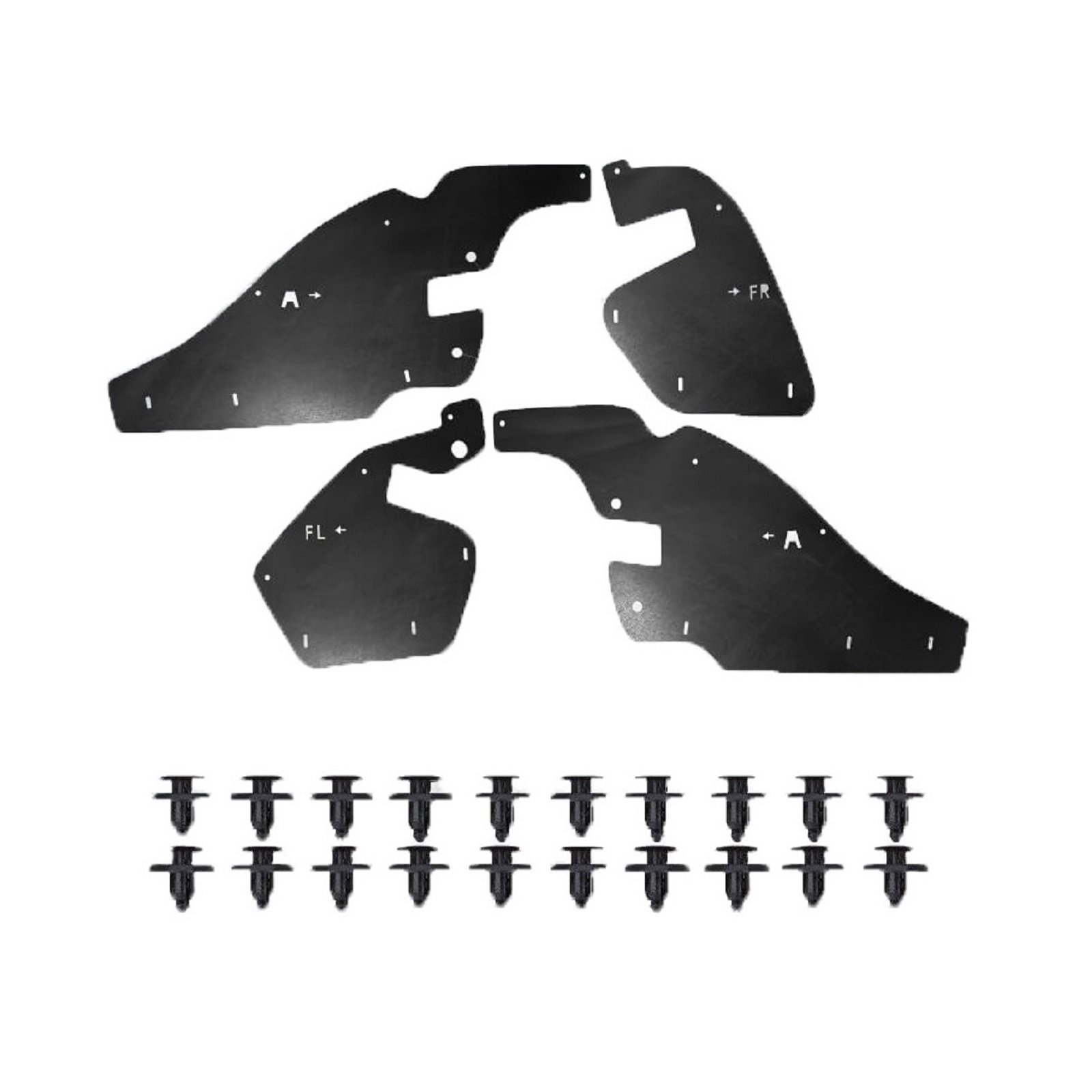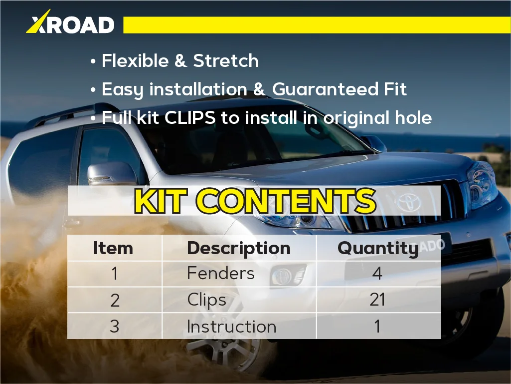 Склад комплекту: 4 посилених пильники для передніх колісних арок, монтажний набір кліпс, інструкція.