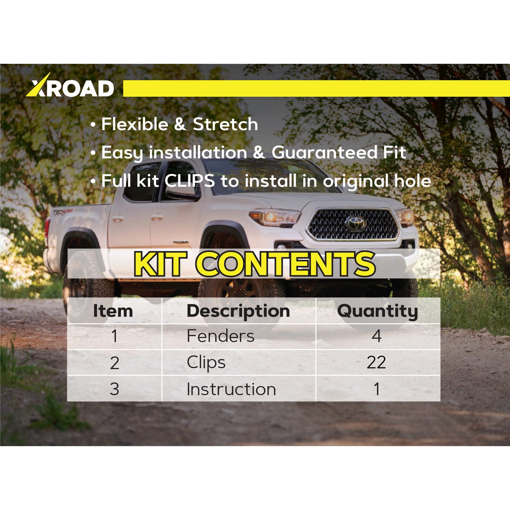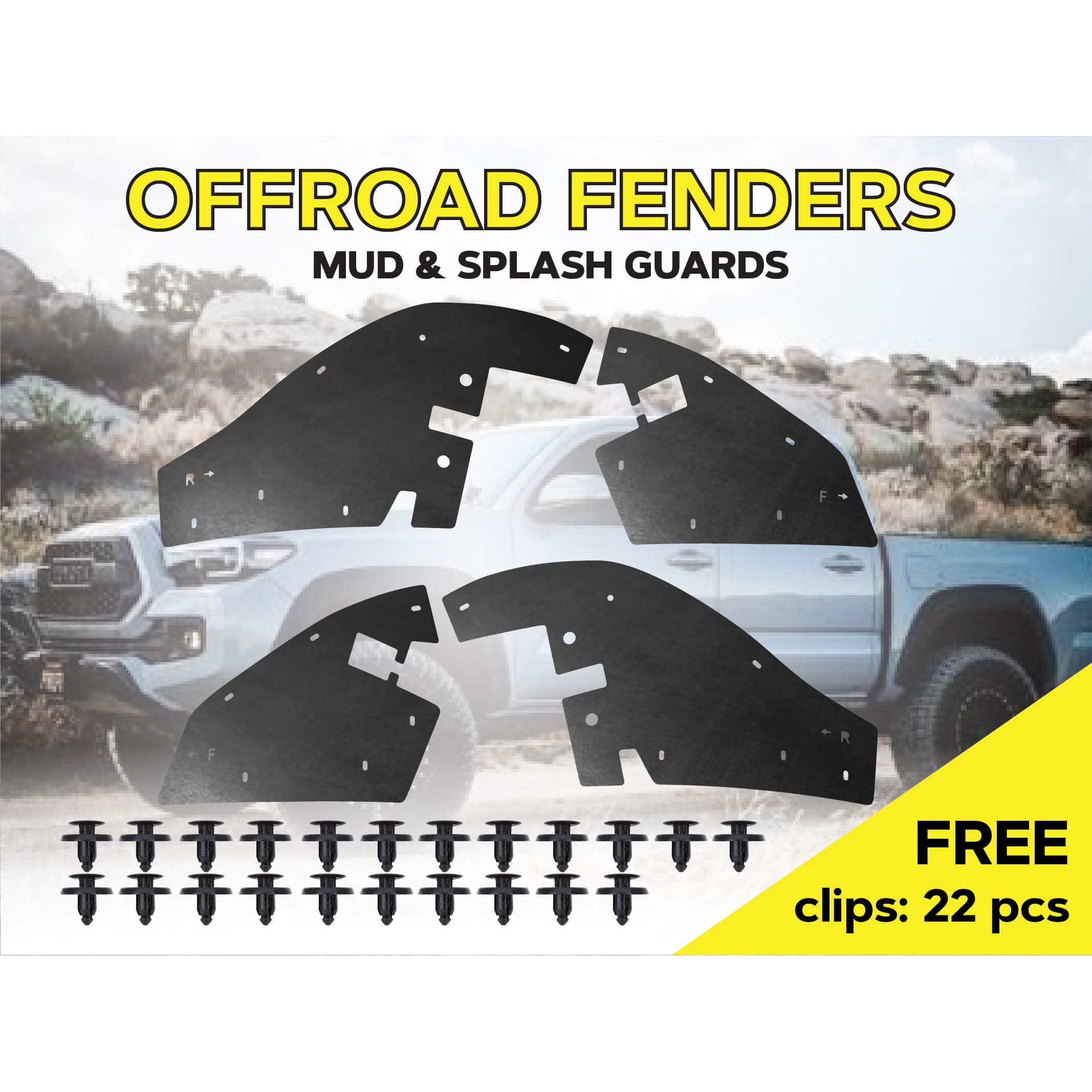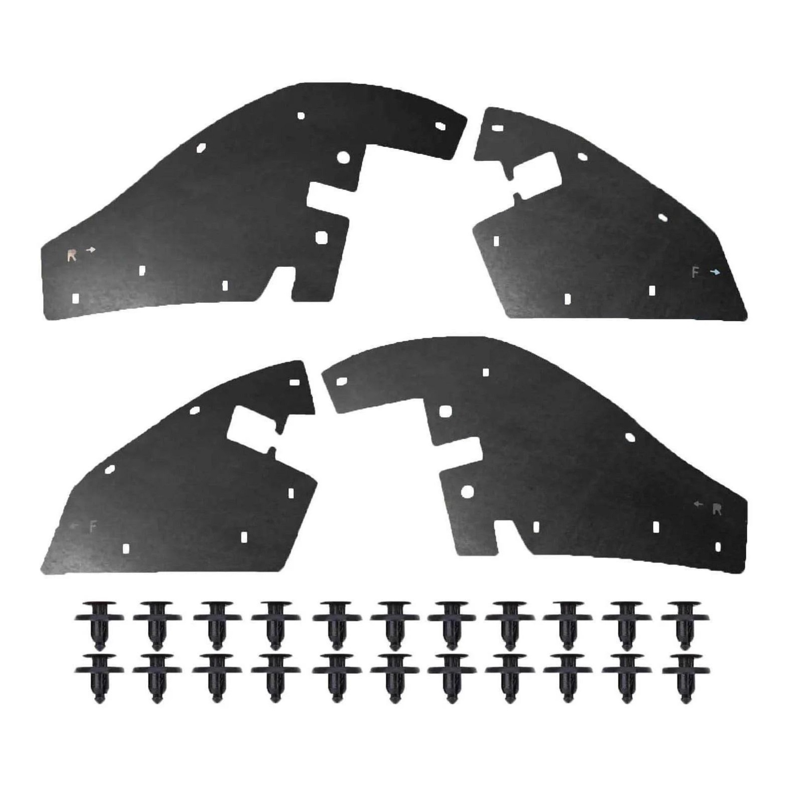 Склад комплекту: 4 посилених пильники для передніх колісних арок, монтажний набір кліпс, інструкція.