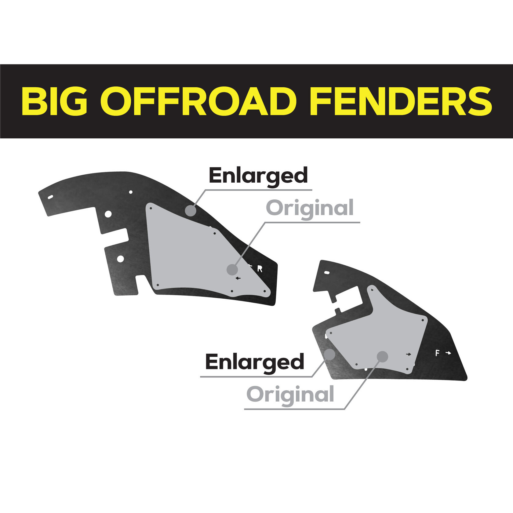 Повний комплект офроудних пильників моторного відсіку для встановлення на передню вісь автомобіля. Площа офроудних пильників значно більша за штатний, що дозволяє йому ефективно захищати не тільки моторний відсік, але й важливе електрообладнання, таке як генератор і стартер. Цей посилений брудозахист розроблений спеціально для експлуатації як у міських умовах, так і на найскладніших позашляхових трасах.