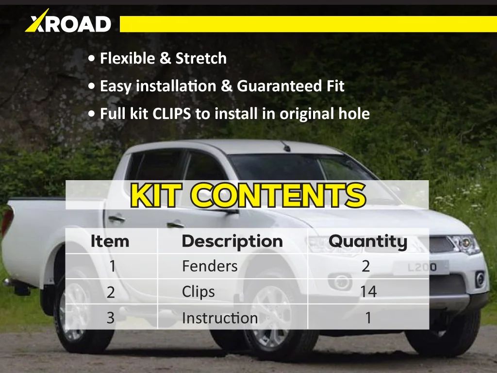 Склад комплекту: 2 посилених пильники для задніх колісних арок, монтажний набір кліпс, інструкція.