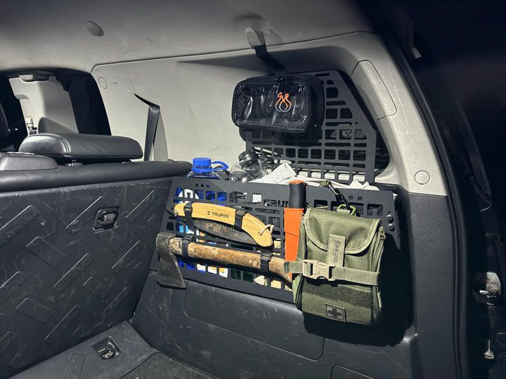 Стінки органайзера розроблені у форматі molle-панелі, що дозволяє закріпити армійські підсумки, вогнегасник, сокиру, ніж, ліхтарик тощо. Круглі отвори дозволяють кріпити гумові стропи, клепальні гайки і підходять для універсальних гумових кріплень типу QuickFist.