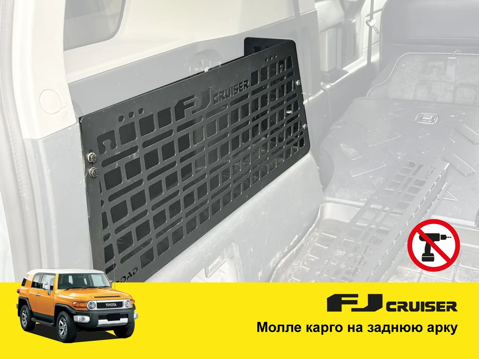 Для звичайної “міської” експлуатації можливе встановлення молле-панелі без свердління отворів – панель кріпиться за “барашки” по боках багажника. Якщо передбачаються важкі умови експлуатації бездоріжжям, у комплекті передбачені додаткові кронштейни для кріплення до панелей обшивки.