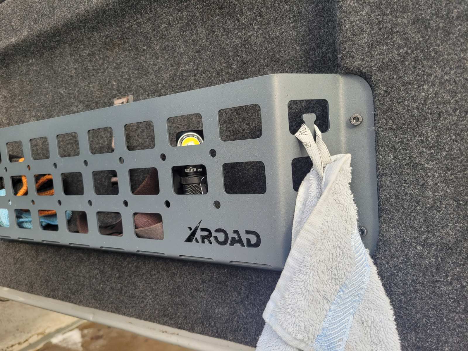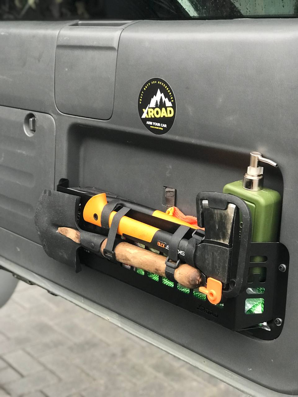 Органайзер виконаний в форматі молле панелі, що дозволяє розміщувати речі не тільки в середині, а і ззовні за допомогою різних систем кріплення. Розмір молле-вікон стандартний для модульної системи армій країн НАТО, що дозволяє кріпити різноманітні армійські підсумки. Круглі отвори дозволяють кріпити гумові стропи, клепальні гайки та підходять для універсальних гумових кріплень QuickFist. Органайзер обладнаний з обох боків двома гачками для рушників. У нижній частині розміщена відкривачка для пляшок.