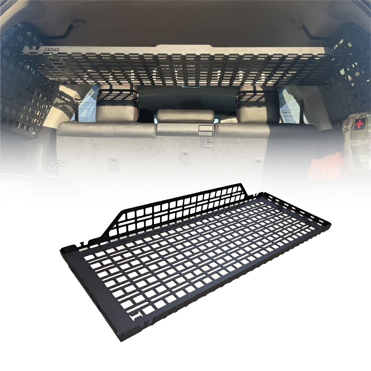 Полиця виконана у форматі молле-панелі, що дозволяє кріпити тактичне спорядження, зброю або інструменти за допомогою різних систем кріплення. Установка полиці проста, швидка і не потребує свердління деталей автомобіля.