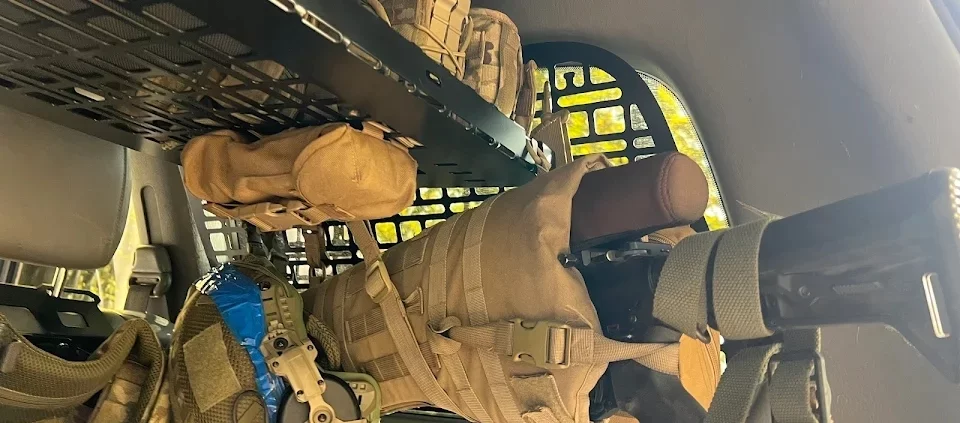 Конструкція полиці дозволяє кріпити необхідні речі до полиці не тільки зверху, а й знизу, тим самим забезпечуючи додаткове місце зберігання в багажнику. Розмір молле-вікон стандартний, що дозволяє кріпити типове армійське спорядження. Круглі отвори дозволяють кріпити гумові стропи, клепальні гайки та підходять для універсальних гумових кріплень QuickFist.