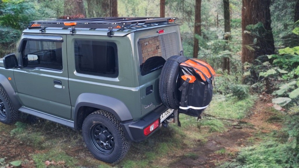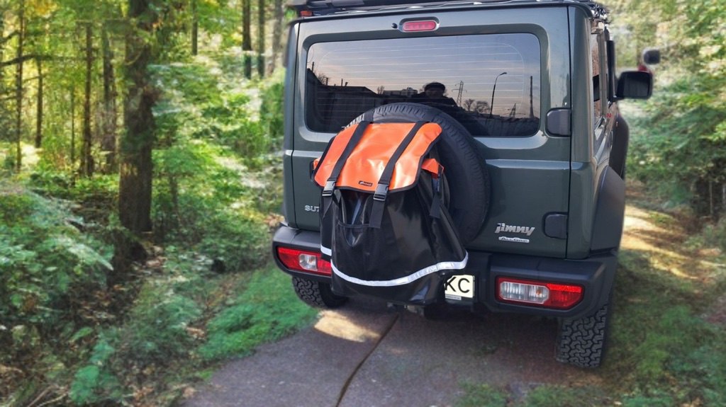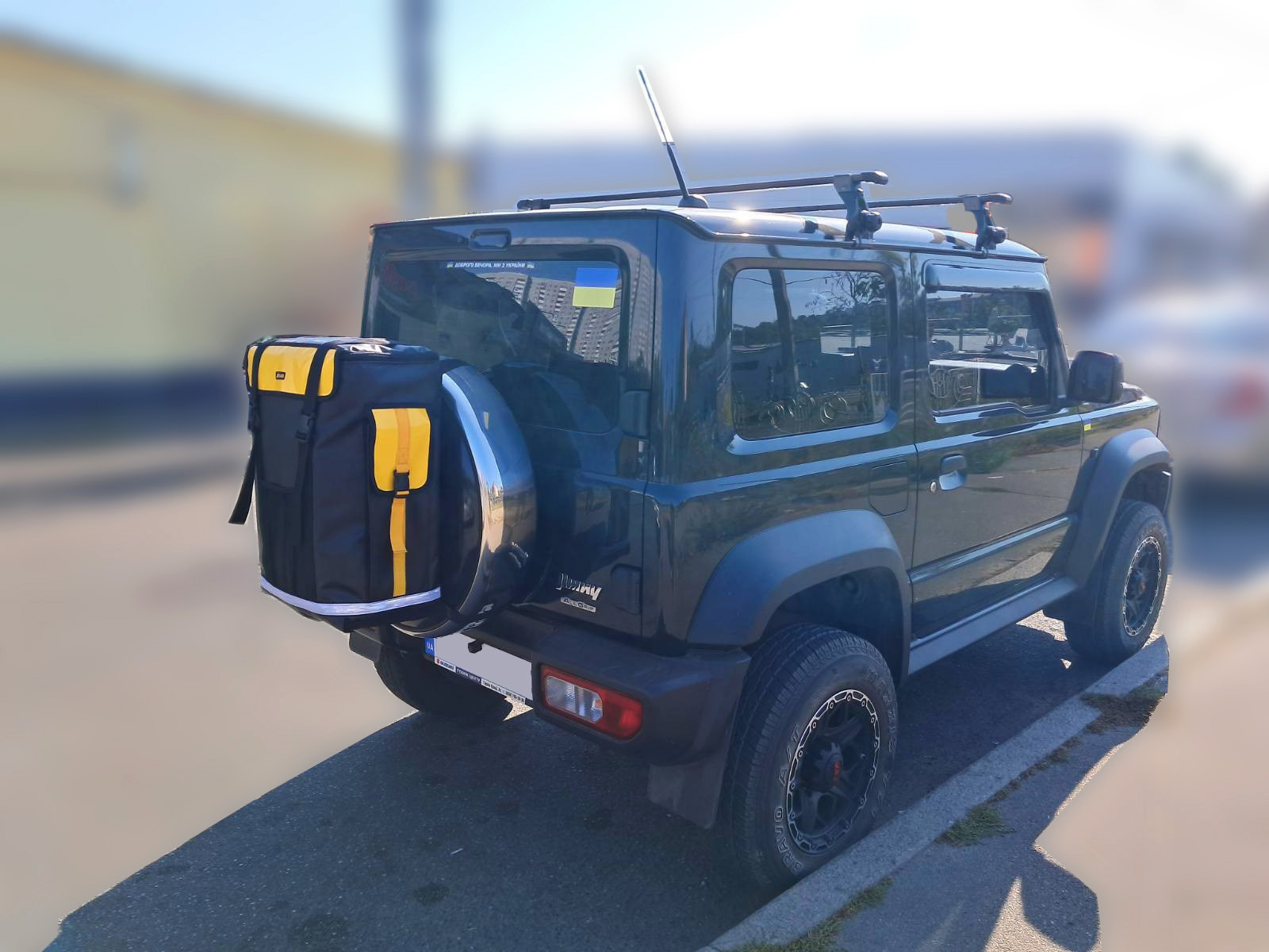 Кріплення до запасного колеса або дверей багажника здійснюється за допомогою двох довгих міцних поздовжніх та однієї поперечної нейлонових строп.