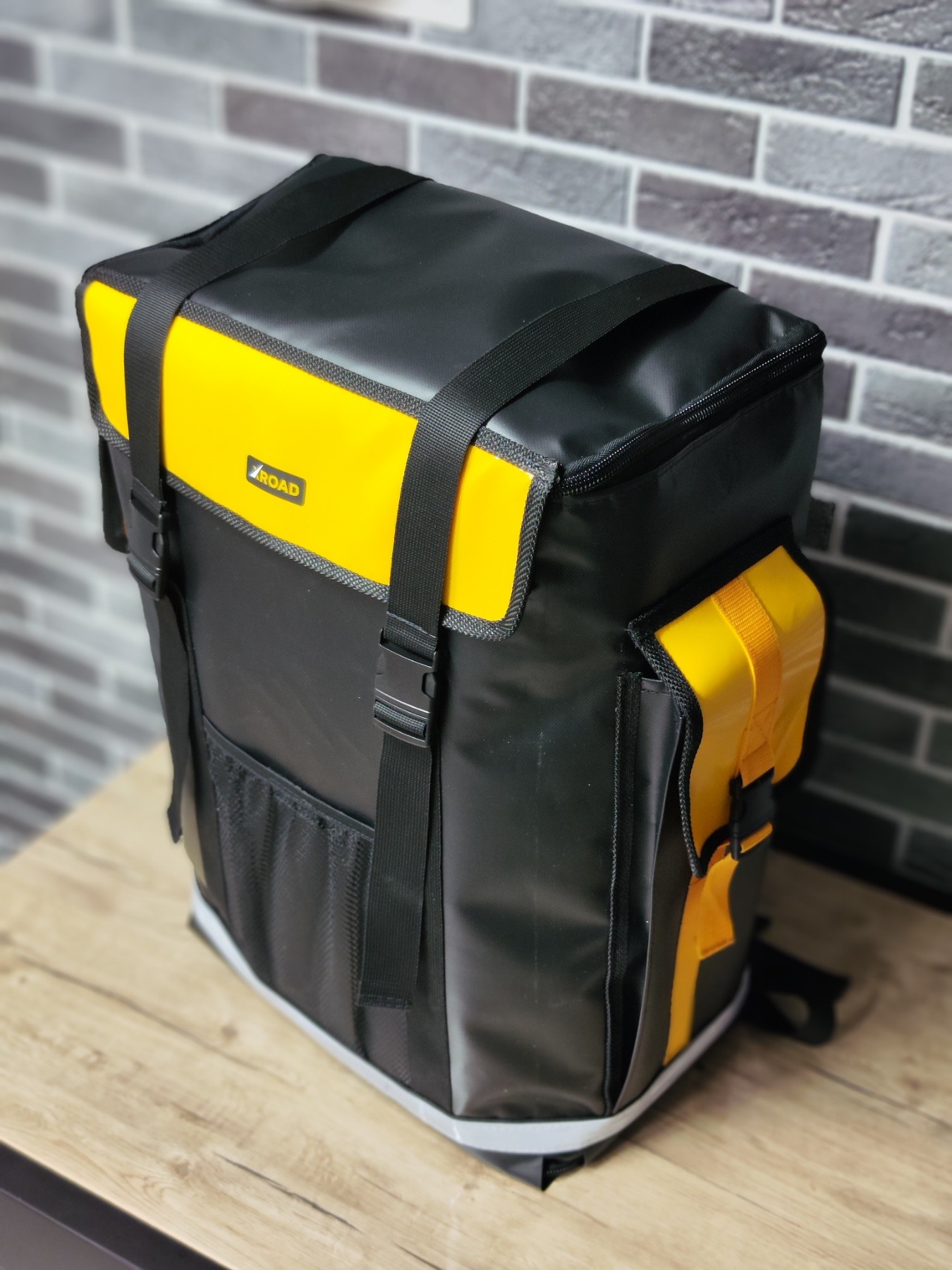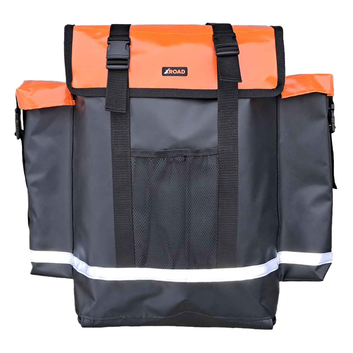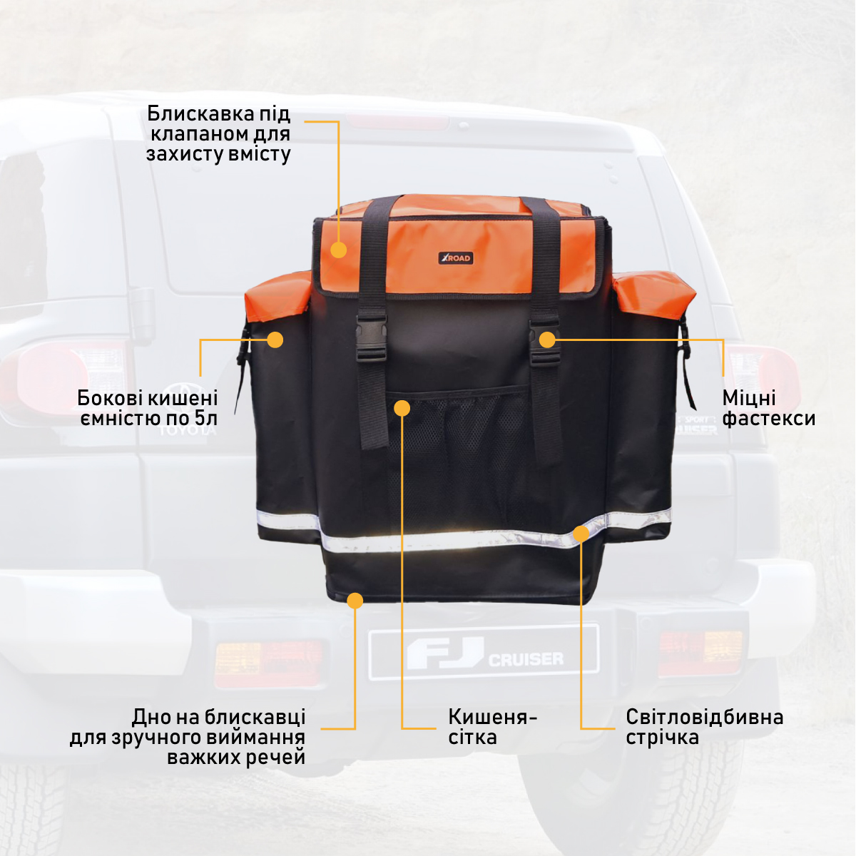 Сумка відкривається знизу на блискавці для того, щоб було зручніше виймати важкі речі, наприклад, пакет зі сміттям. Дно на великій міцній блискавці, через яку без проблем витікає непотрібна рідина, також передбачений другим шаром додатковий нижній клапан на липучці для надійного транспортування. Великий верхній клапан також на блискавці для захисту від дощу та попадання пилу. Світловідбивна смужка забезпечує підвищену видимість та безпеку у нічний час. Сітчаста кишеня попереду зручна для швидкого доступу, наприклад, щоб покласти брудні рукавички.