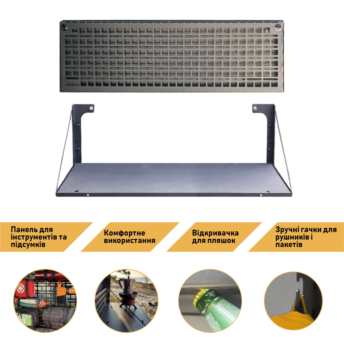 - В складеному стані стіл виконаний в форматі моллє-панелі, що дозволяє розміщувати тактичне спорядження, зброю або інструменти за допомогою різних систем кріплення.